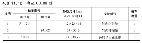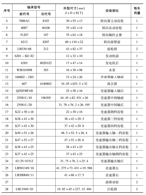 | 序号 | 軸承型(xíng)号 | 外(wai)形尺寸(mm) | 安裝部(bù)位 | 每(měi)車用量 | |