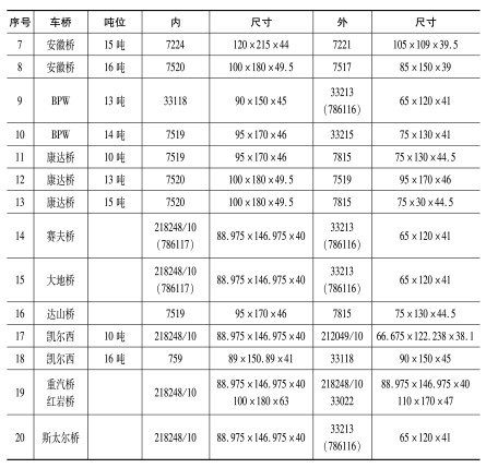 | 19 | 重汽橋 紅岩(yán)橋 | | 218248/10 | 88.975×146.975×40 100×180×63 | 218248/10 33002 | 88.975×146.975×40 110×170×47 |
